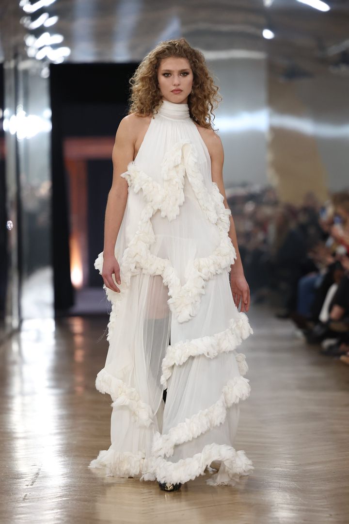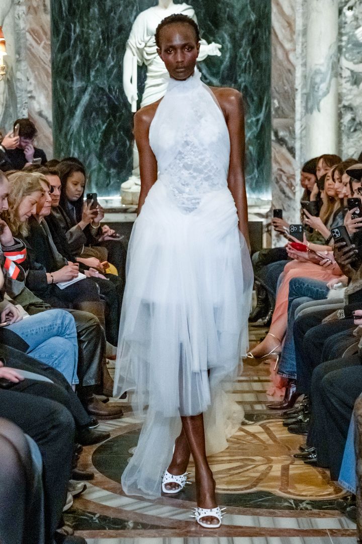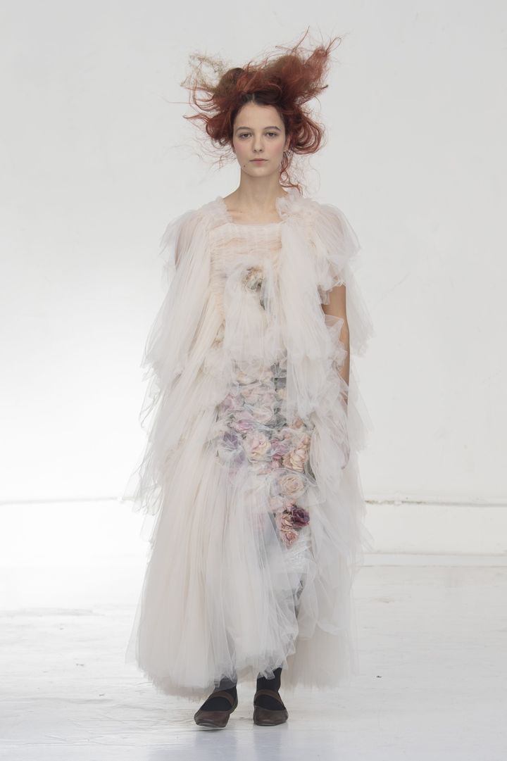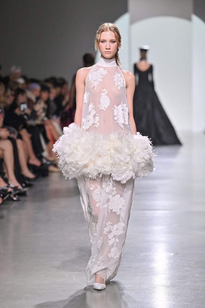 シアーな白のオーガンジーに繊細なフローラル刺しゅうを施したホルターネックドレスは、腰まわりを大胆に彩るフェザーがなんともフォトジェニック。元バレエダンサーのデザイナーらしく、バレエコアなエッセンスが感じられる一着です。