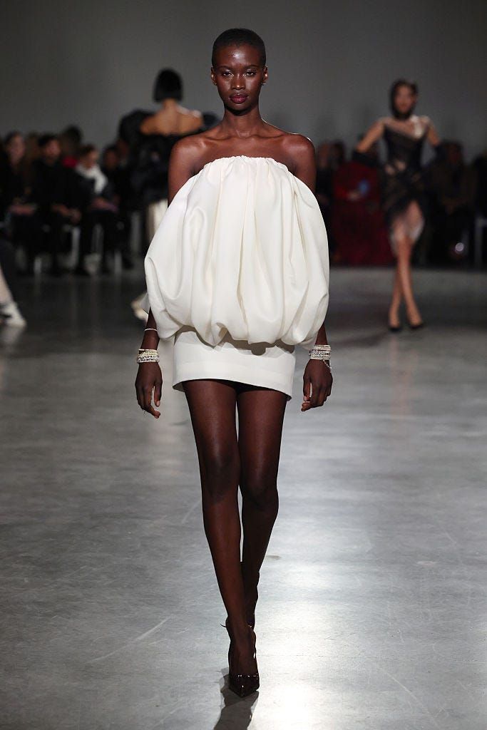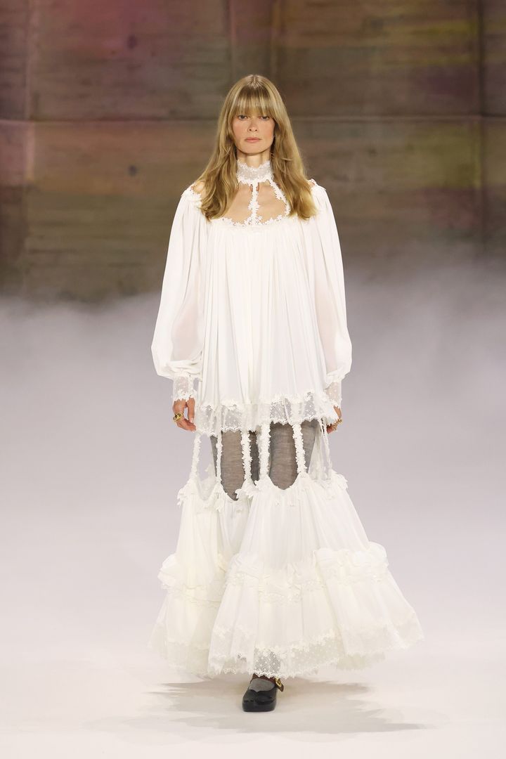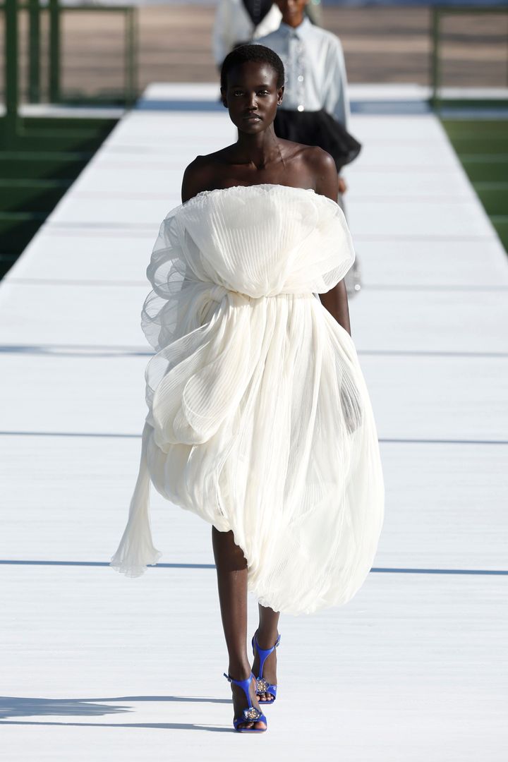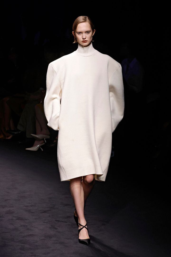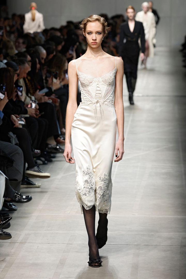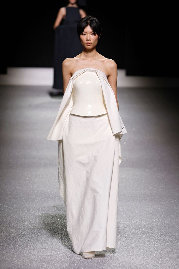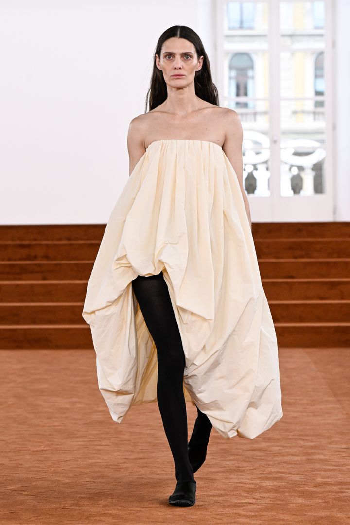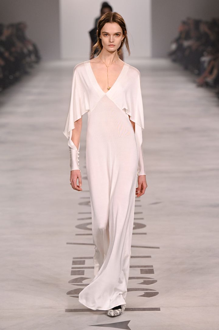 マリア・グラツィア・キウリのデビュー作となった今回のショー。クラシカルな気品と、現代的なミニマリズムが同居するサテンドレスは、ケープ風のカッティング、手首を強調するロングカフスとボタンのディテールがモダンさを演出しています。