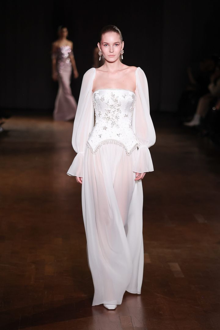 パールとクリスタルが上品に煌めくエレ派のためのドレス。 透け感のあるシフォン素材のパフスリーブ、 構築的なコルセットラインから流れるように続くシアーなスカートが、優雅でありながらセンシュアルな魅力を引き立てています。
