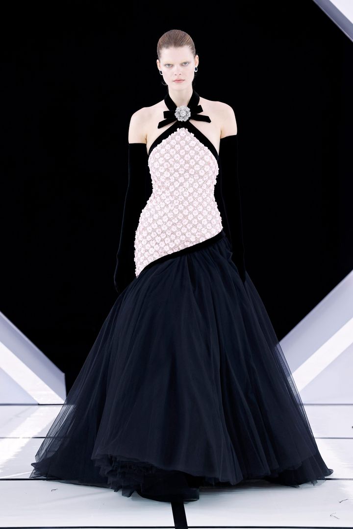 立体的な小花が敷き詰められたボディス、アシンメトリーに切り替えられた漆黒のチュールスカートがドラマチック。首元のベルベットリボンと輝くビジュー、そしてオペラグローブが、ハリウッド・グラマーなムードを加えています。