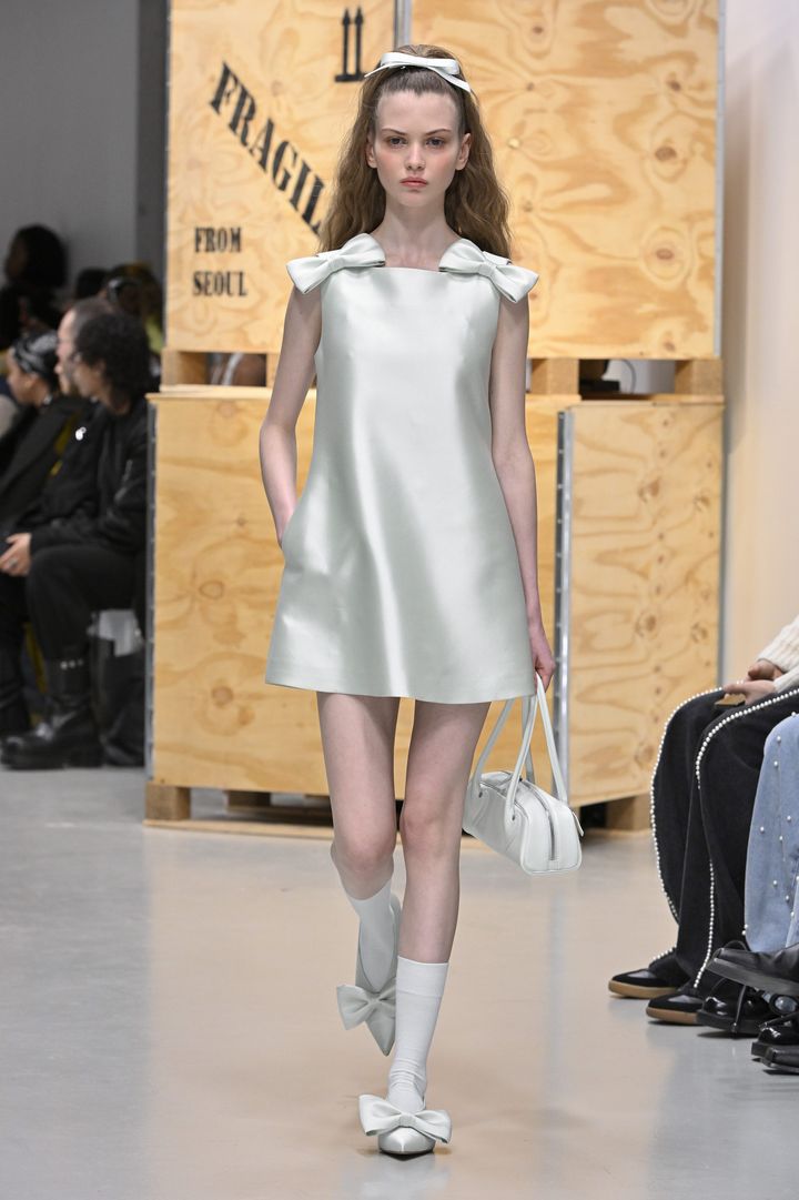 韓国出身のデザイナーが手がけるパリ発ブランド。潔いシルエットとパールホワイトの光沢が美しいミニドレスは、両肩と足元に配されたビッグリボンが、遊び心とガーリーなエッセンスを加えています。