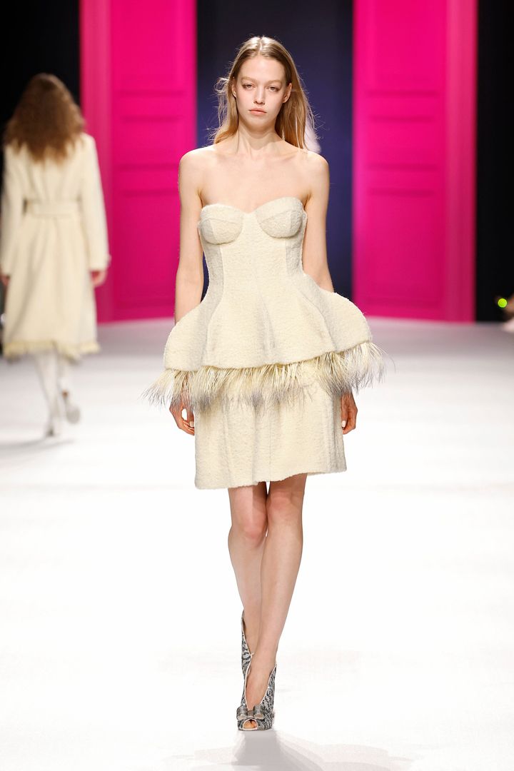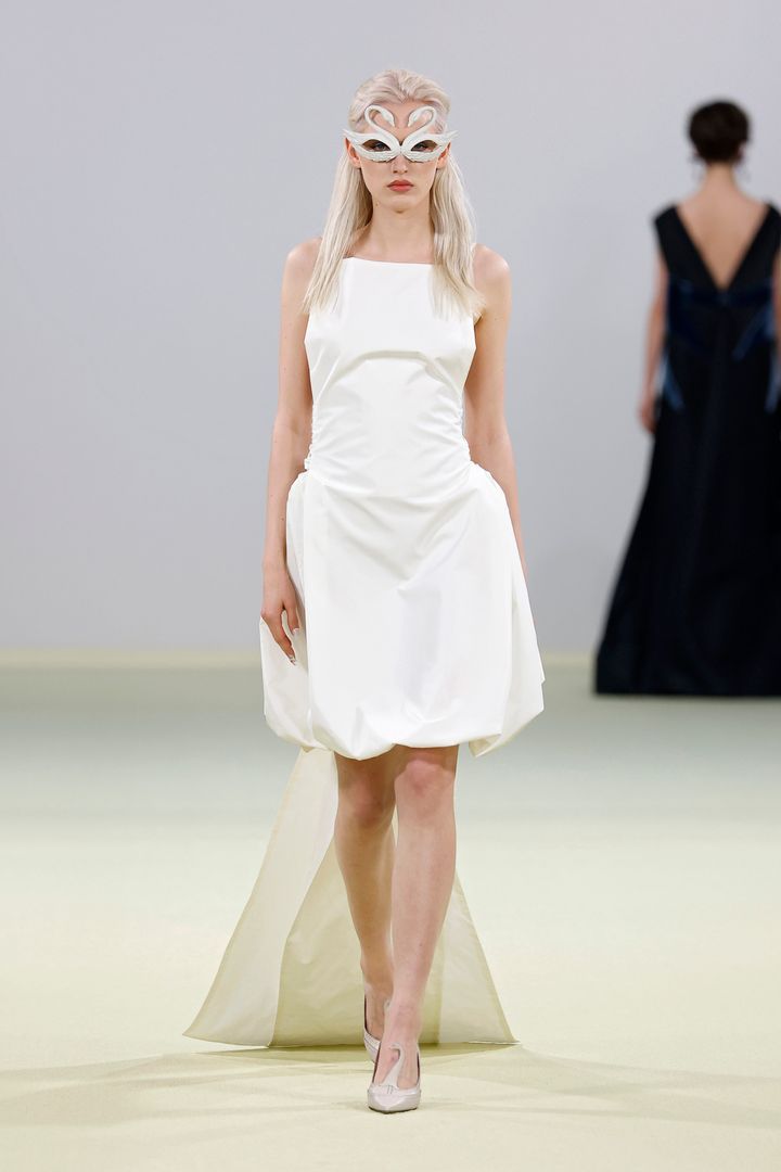 バルーンシルエットのミニドレスに、たなびくロングトレーンを合わせた緩急あるデザイン。ブランドのアイコンであるスワンをモチーフにしたアイマスクやパンプスが、エッジの効いた愛らしさを演出しています。