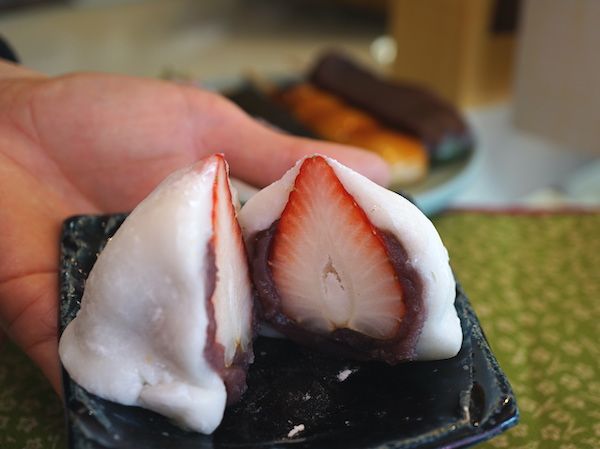 「いちご大福」も昼過ぎには売り切れてしまう人気の品。子どもの握りこぶしくらいの大きさがある。