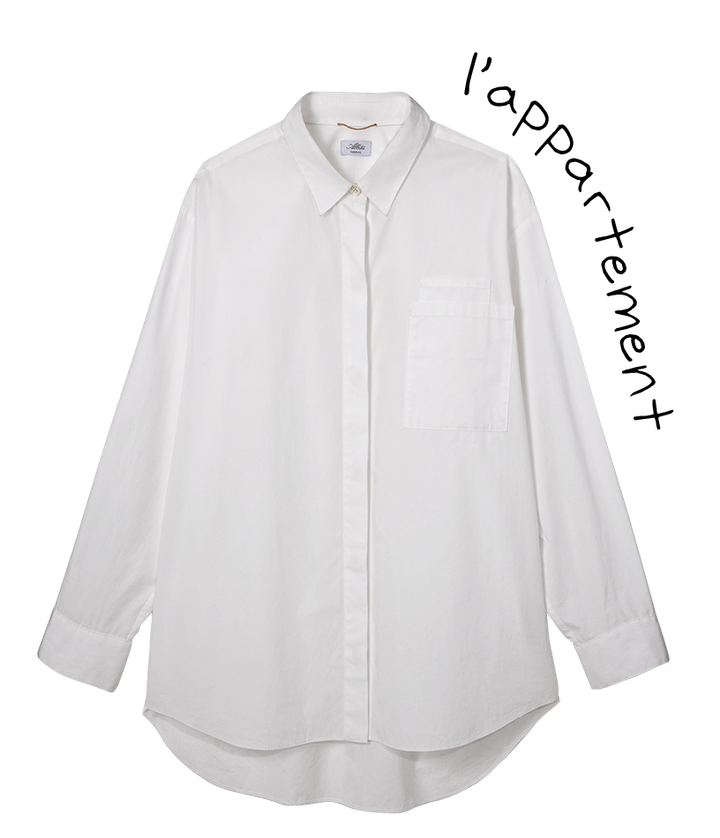 王道ドレスシャツをシンプルに1枚で着るなら、少しオーバーサイズのリラックスシルエットを。すっきりとしたテーラリングに糊のきいたバレルカフス、そのきちんと感が今季らしい白シャツは「トーテム」。ファブリックをよく見ると、ほのかに透け感のある白×白のストライプになっていて、シンプルながらも奥行きのある洗練が素敵。カプリパンツにミニバッグ、スリングバックシューズなど、90年代なムードで。