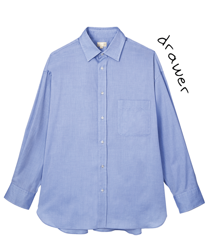 オーバーシルエットのサックスブルーシャツは、一見マニッシュ。でも、美しい光沢とやや落ち感のあるコットン地の質感が、品のあるクリーンな女性らしさを感じさせる1枚。