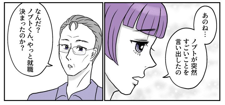 私は50代のコハル。夫のキッペイと二人暮らしです。一人娘のツムギは23才で、去年大学を卒業して就職し、職場の近くでアパート暮らしをしています。ある週末、ツムギが浮かない顔でわが家にやってきました。どうやら同い年の彼氏、ノブトくんのことで困惑しているようです。ノブトくんは大学卒業後も定職に就かず、アルバイトで暮らしていました。ようやく就職が決まったのかと思いきや……私たちは思いがけない話を聞かされることになったのです。