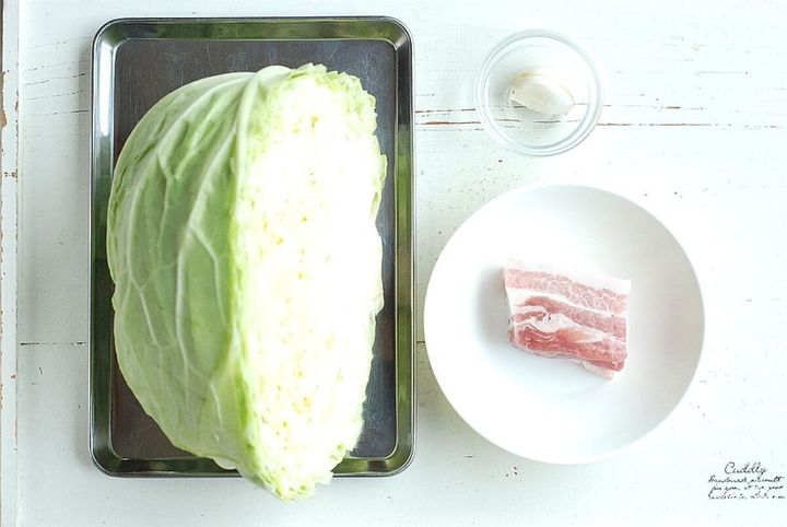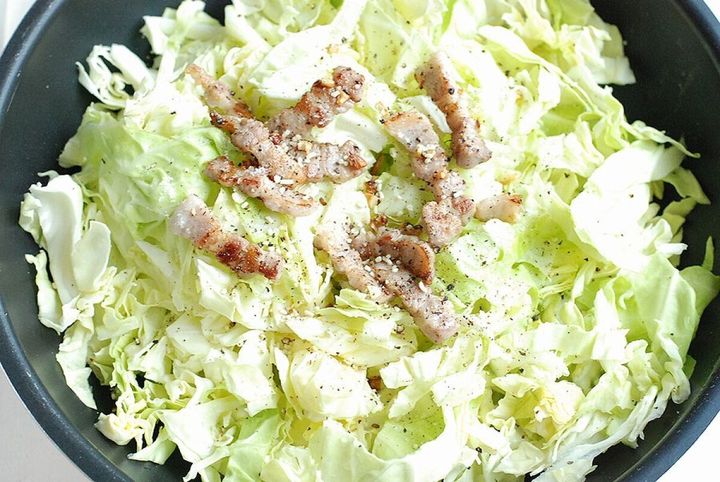 ④ キャベツをフライパンに入れ、豚肉とニンニクをキャベツの上に戻し入れる。塩とブラックペッパー、鶏ガラスープをふり、蓋をして弱めの中火で20分間ほど、時々上下を返しながら蒸し焼きにする。
