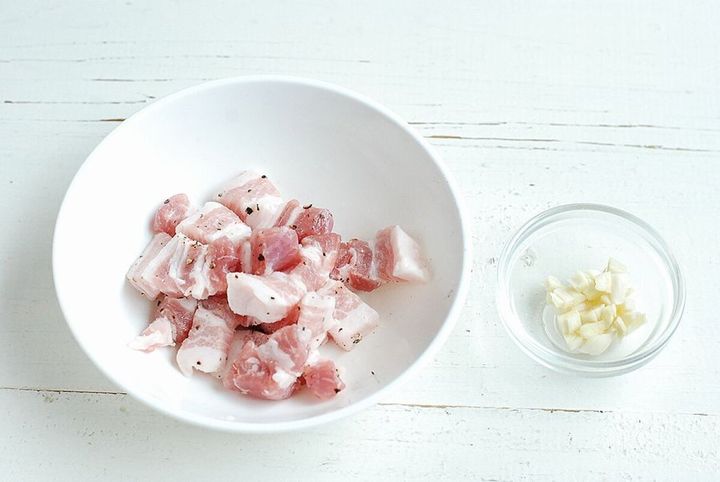 ① 豚肉は1cm幅の棒状に切って、酒と塩、ブラックペッパー少々を揉みこむ。にんにくは皮を剥いてみじん切りにする。