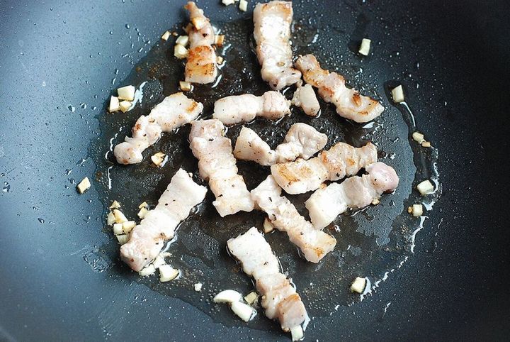③ フライパンにサラダ油を熱し、にんにくと豚肉を中火でカリッとするまで炒める。火が通ったらいったん取り出す。