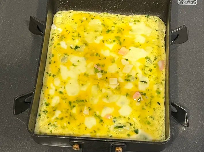 卵液をよく混ぜたら、玉子焼き器で焼きます。