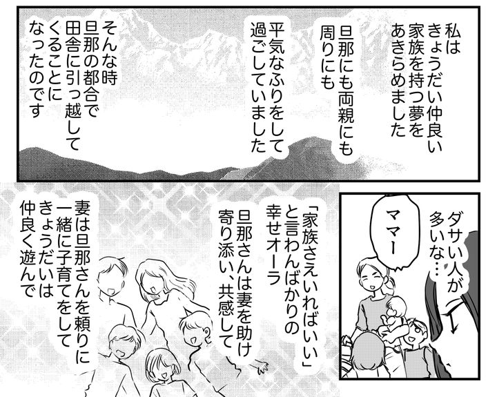 旦那の都合で、田舎に引っ越してくることになりました。まわりはオシャレなんて気にしない人ばかりで、「家族さえいればいい」と言わんばかりの幸せオーラをふりまいています。狭い世界で「幸せです」なんて顔しちゃって。