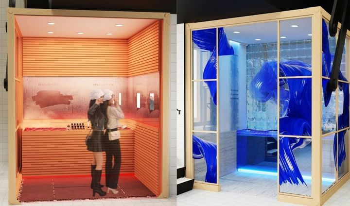 右:水風呂のスペースは「アンリミテッド ケア ツヤ セラム ファンデーション」がテーマ。みずみずしい世界観の中で、うるおいのあるツヤ肌撮影をしてみては。左:サウナのスペースで体験できるのは「アンリミテッド ラスティング フルイド」の崩れにくさ。ほてりフィルターで特別な記念写真を。