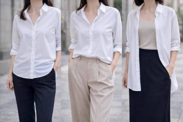 以前は、身体に沿うコンパクトな白シャツがきれいめスタイルの定番でした。でも、ぴったりとしたシルエットは上半身が詰まって見えやすく、コーデ全体のバランスが少し前の印象に見えることがあります。