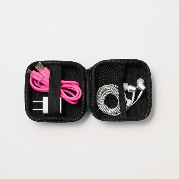 ガジェットケースは両開き仕様で、開け口が大きく開くのが特徴。ベルトとポケットで仕分けができる設計で、モバイルバッテリーなどガジェット類をしっかり固定。絡まりがちなコード類もすっきりコンパクトにまとめられます。ガジェット以外にもリップなど小物を入れるのにもぴったりなサイズ感。あらゆるシーンで使える便利なケースです。