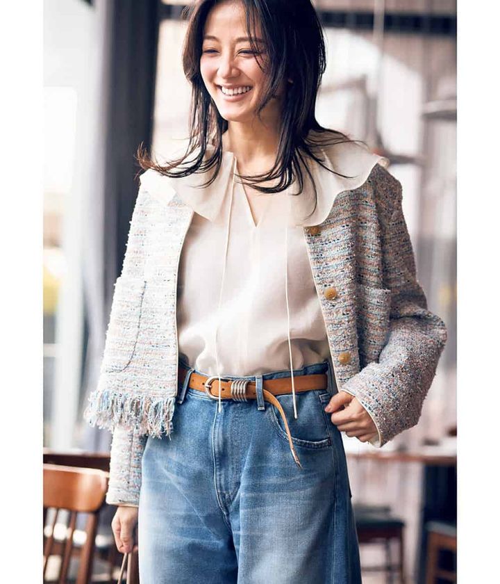 ベルト¥57,200(デアンシェ/エスアンドティ)ジャケット¥143,000ブラウス¥33,000(ともにデパリエ/デパリエ 伊勢丹新宿店)デニムパンツ¥27,500(ジャパン ブルー ジーンズ/エスアンドティ)バッグ¥45,100(ヴァジック/ヴァジックジャパン)ピアス¥16,500(ジャミレイ/エルディスト ショールーム)