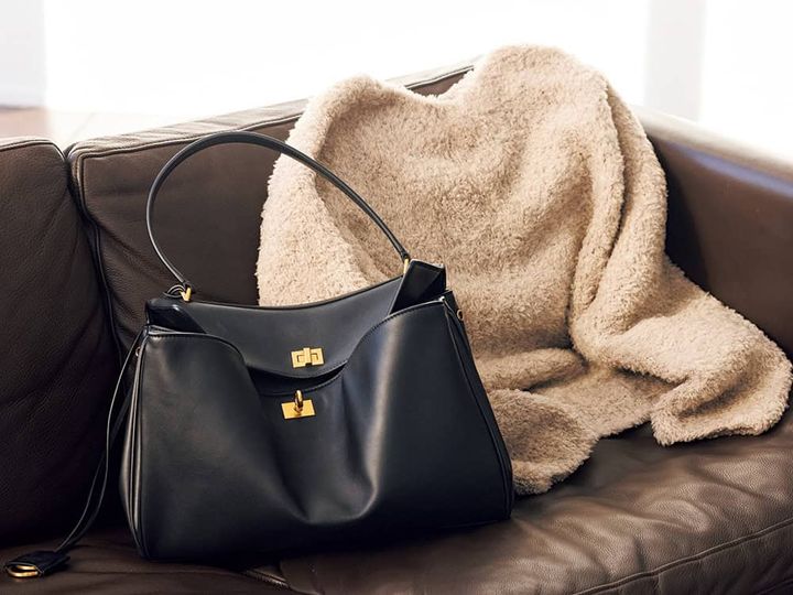 ”Chaos”のふわモコニットは贅沢な身幅で自然な落ち感が。バッグは開けたように持つラフさが学生カバンをずるっと肩掛けしていた高校時代の自分とリンクする”BALENCIAGA”。