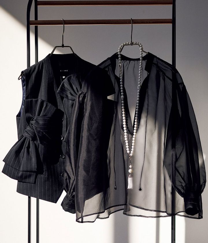 〈右から〉大人のオーラが1枚で叶う”NO.b”のシアーブラウス。ベルトにもネックレスにもなる”IRIS47”のパール。おじさん素材にビッグリボンがめちゃモードな”CADUNÉ”。