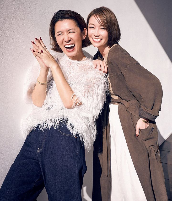 <右>辺見えみりさん&conteのコート、<左>大草直子さん&Cygneのトップス