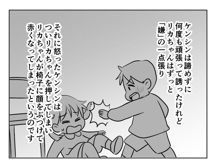 あーーーーもう! ケガして泣いているお友達に向かって「あんたがわが子を拒否するから」って……。ストーカーやモラハラの思考に近すぎてハラハラしてしまいます。まずは「押してしまってゴメンね」と思うものではないでしょうか。そして相変わらずケンシンくんはリカちゃんにつきまとっている模様。きっと先生たちもケンシンくんの面倒を見たり、ほかのお友達と遊ぶことを促したりしているのでしょう。それをケンシンくんが受け入れられないこともあるかもしれませんが、だからといって「ウチの子の気持ちを優先」が根底にあると話はどんどんこじれていきますよ? エツコさん。