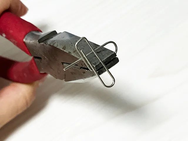 2. ニッパーで曲げて切る ゼムクリップをハート型とハンガー型に変える1分DIY術