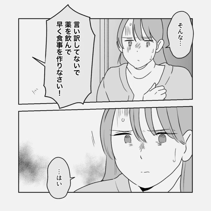 起き上がるのも辛いほどだった義母は義父の言葉に傷つきましたが、「言い訳してないで薬を飲んで早く食事を作りなさい!」とさらに怒られ「・・はい」と言うしかありませんでした。