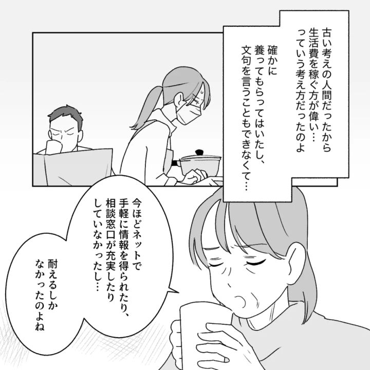 「古い考えの人間だったから、生活費を稼ぐ方が偉い・・っていう考え方だったのよ。確かに養ってもらってはいたし、文句を言うこともできなくて・・。今ほどネットで手軽に情報を得られたり、相談窓口が充実したりしていなかったし・・耐えるしかなかったのよね」と義母は当時を振り返りながら、どんなに辛くても耐えるしかなかったと話してくれました。
