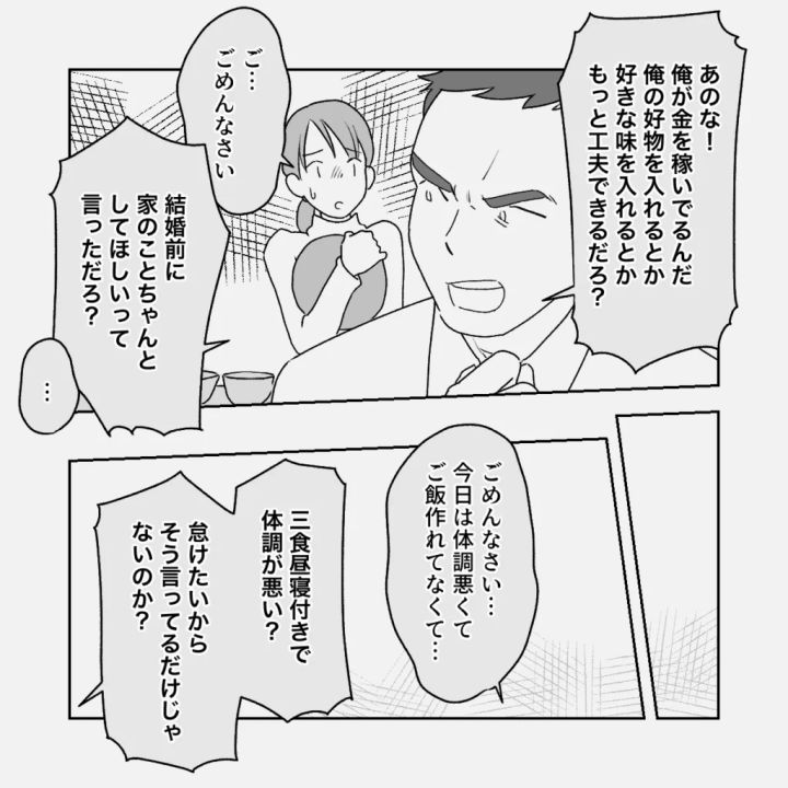 「あのな!俺が金を稼いでるんだ。俺の好物を入れるとか好きな味を入れるとか、もっと工夫できるだろ?」と強い口調で怒り始めました。「ご・・ごめんなさい」と謝るも「結婚前に家のことちゃんとしてほしいって言っただろ?」と言われ、義母が体調を崩してしまった時も「ごめんなさい・・。今日は体調が悪くてご飯作れてなくて・・」と謝っても「三食昼寝付きで体調が悪い?怠けたいからそう言ってるだけじゃないのか?」と体を心配するどころか夕食ができていないことを怒られました。