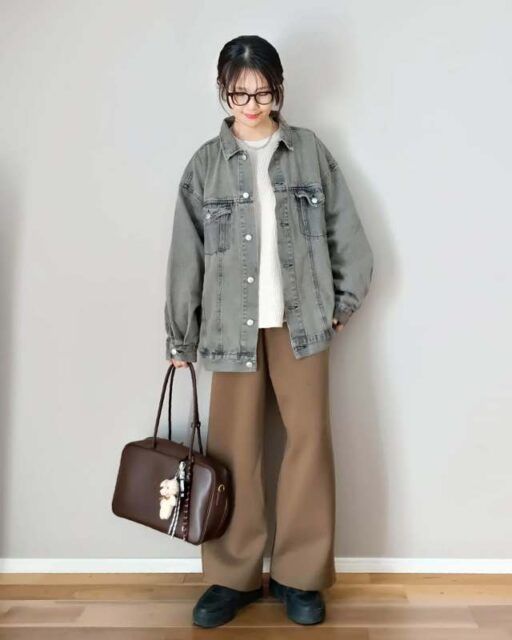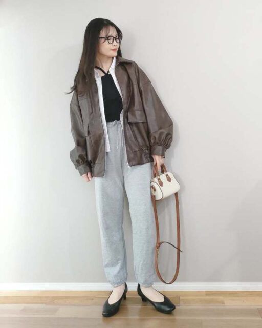 スナップでは、メンズライクなブラウンのレザーブルゾンをチョイス。スウェットパンツのリラックスしたムードに馴染みつつ、コーデ全体に洗練された印象も添えてくれます。