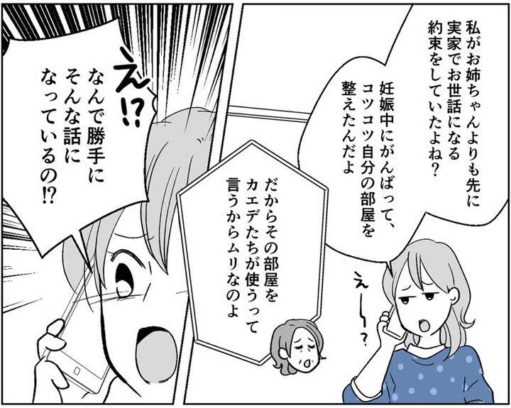 『もうすぐ里帰り出産をする予定だったのに、私が実家で使う予定の部屋を姉家族に乗っ取られてしまった。姉はこのタイミングで離婚協議中になり、私が使う予定の部屋を姉と甥っ子たちが使うことになったらしい。私はもうすぐ出産する予定なのに、「できれば里帰りしないで」、「困っている孫たちを放っておけない」と母から言われてしまった。胎教に悪いから考えたくないけど、家族だからこそ本当に信じられない』出典:https://mamastar.jp/bbs/topic/4513372
