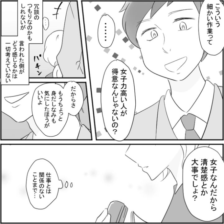 主人公が働いている会社には女性に対しての言動がおかしい同僚がいました。だんだんその言動も問題になっていき・・・。