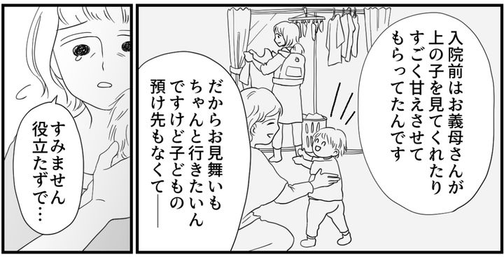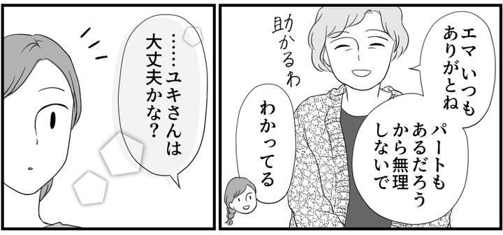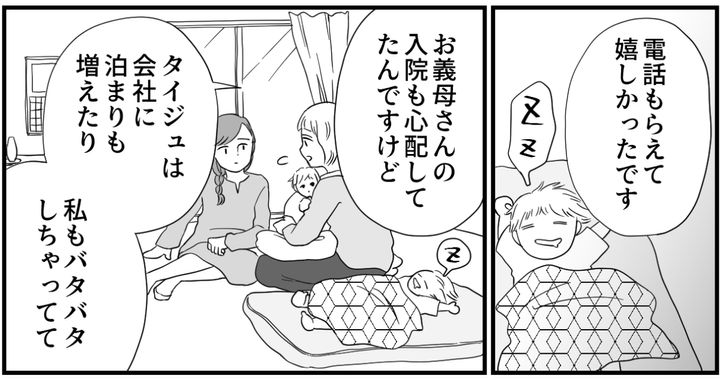 タイジュは激務で、ユキさんは体調が思わしくない日々が続いて……。私そんなことも知らずにプリプリとしていて、自分が嫌になってしまいました。2人はきちんと母を心配していたのですから。