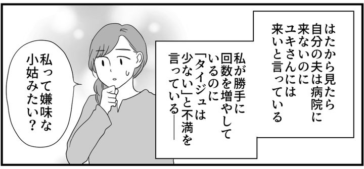 後日病室にて。母からユキさんの話題が出ました。タイジュの状況もユキさんの状況も初耳で驚きました。(そういえば……)私は意地になって、タイジュにもユキさんにも直接連絡をしていないことに気がついたのです。