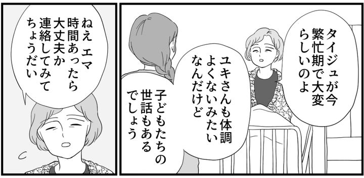 私はエマ(36)。夫のタケオミ(38)と小学生(1年、3年)の子ども2人と暮らしています。現在母が入院中。私は電車に乗って週3~4日母の元へ行くのですが、弟のタイジュ(33)は月に4回ほど。弟嫁のユキ(32)さんはこの2ヶ月一度もお見舞いに来ない、と夫に愚痴をこぼしました。すると夫は「自分も行っていないけれど、その分エマが行きやすいように協力してきた。きっとユキさんもそうだ」と言うのです。しかし、弟夫婦の家は病院まで徒歩圏内。納得がいきません。