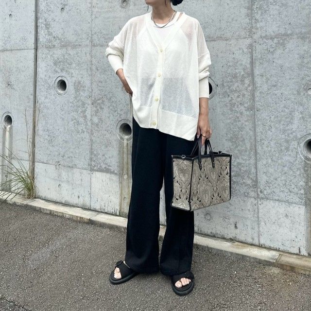 シアーカーディガンはその透け感を楽しむべく、ヘルシーなインナーを合わせてみましょう。春ならではの軽やかさと抜け感あるレイヤードスタイルは、露出を抑えながらオシャレに仕上がるのが40代に嬉しいポイント。トップスは白でクリーンに、ボトムを黒で締めるモノトーンコーデでまとめると、簡単にシャレ見えが叶いますよ。