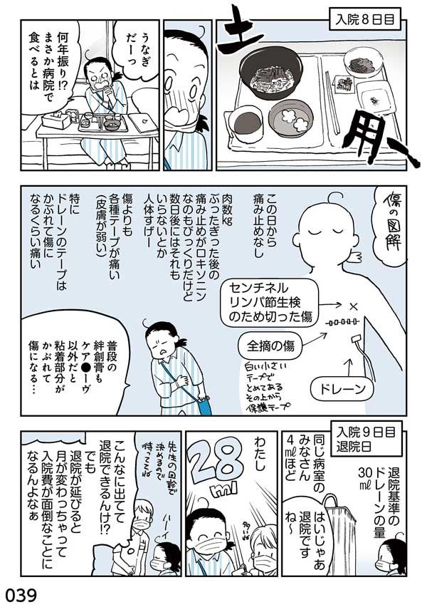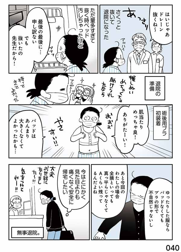 乳がん発覚からあっという間の入院・手術という怒涛の日々。退院でやっとひと息つけるのか? 退院後の日々はどうなるのか? 退院したこの時は、まだわかっていなかったのでした。(ご愛読ありがとうございました。続きは書籍本編でお楽しみください)