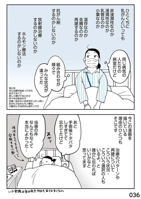 今は乳がんでもいろいろな治療法がある。大部屋に居る人は同じ乳がん患者ではあるけれど、病状の違い、治療法や胸の摘出の有無などで、みんな状況が違っていた。