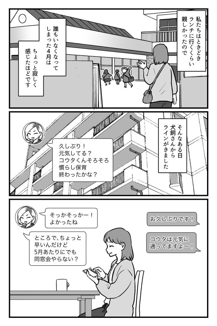 感動的な卒園式が終わり、ようやく肩の荷がおりた頃、犬飼さんからラインが届きました。「ちょっと早いけど、5月あたりに同窓会しない?」という内容でした。ママたちとのつながりがなくなってしまって寂しかったので、そのお誘いがとても嬉しかったです。