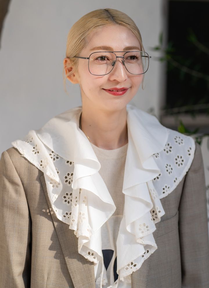ツーブリッジメガネで知的なスパイスをオン。フリルたっぷりのつけ襟との甘辛バランスが絶妙!