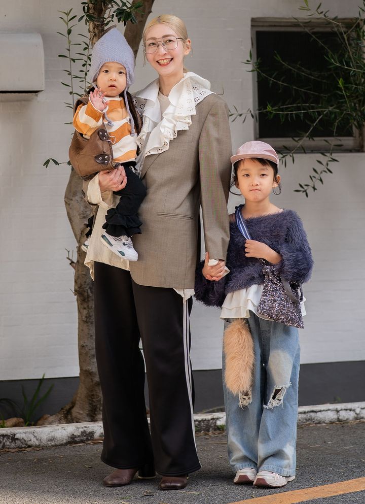祖父母から受け継いだアイテムにを今どきにアップデートした家族コーデ! 甘辛やスポーティMIXなど、テイストのコントラストを楽しんだスタイリングセンスはお見事。コーディネートを一段と盛り上げてくれるヘアアレンジ術もお見逃しなく♪