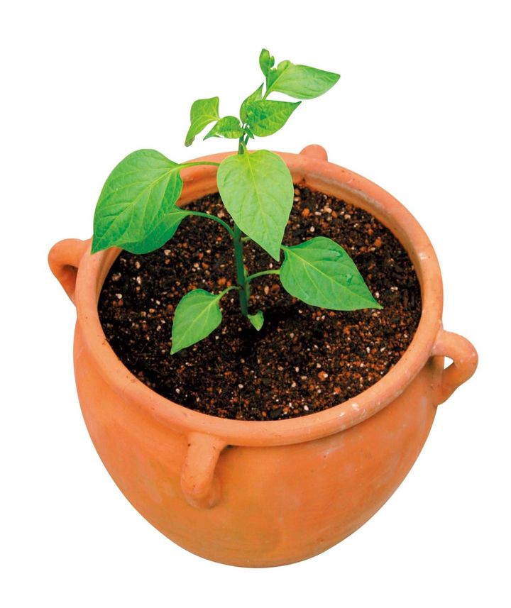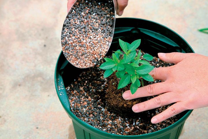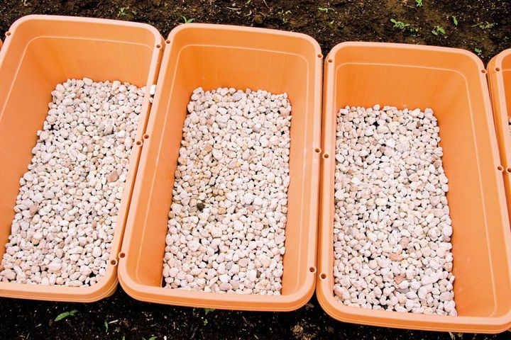 野菜づくりで一番重要なのが「土」。栄養豊富で、有益な微生物が活発に活動している土を用意することが肝心です。野菜の適性を見極めながらさまざまな用土をブレンドし、土づくりをするのも野菜栽培の楽しみの一つですが、初心者なら野菜用の培養土を購入するのが無難。肥料も入っているのでそのまま使用できて便利です。通気性や水はけをよくするため、土の下には鉢底石を敷いて。
