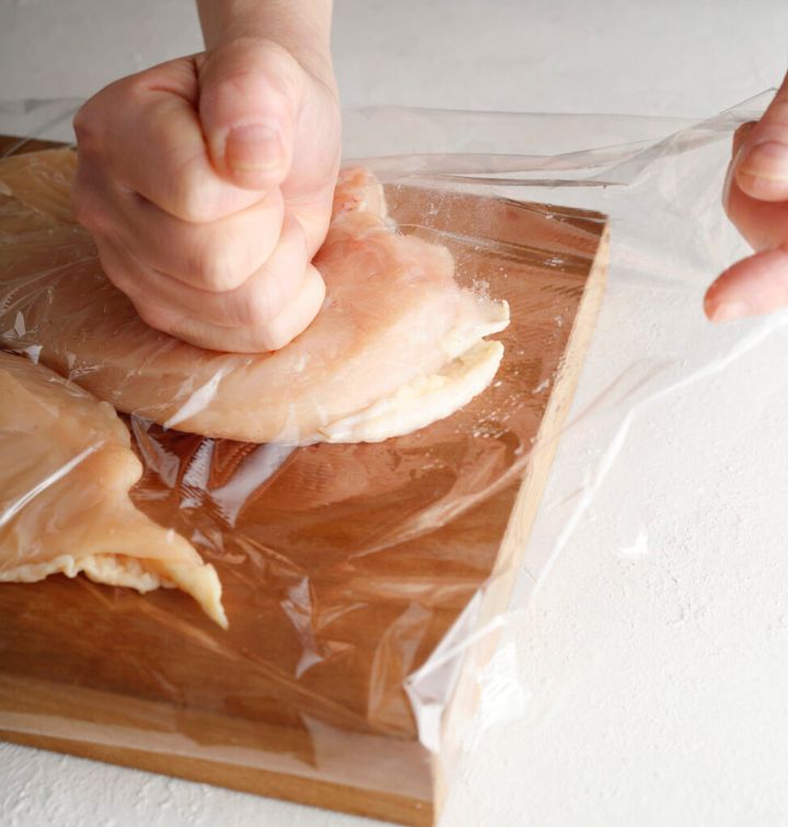ポイント:たたくことで肉の繊維がほぐれて均一に火が通りやすくなります。弾力があるので厚みは少しつぶれる程度でOK!