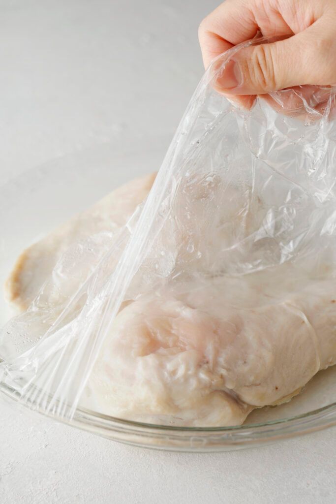 ③鶏胸2枚をアーチ形ふんわりラップで加熱+余熱で火を通す