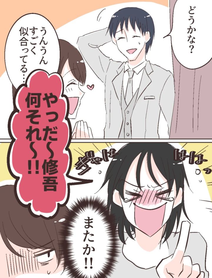 「どうかな?」少し照れた様子でカーテンから姿を現した修吾。やっぱり思った通り、色味も雰囲気もぴったり。「うんうん、すごく似合ってる・・・」そう言いかけた瞬間、「やっだ~修吾、何それ~!」智美さんが修吾を指さし、大声で笑い出しました。