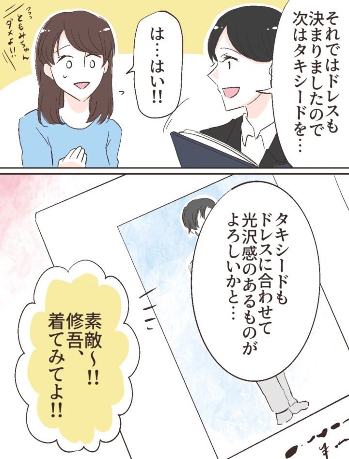 家族でもないのに衣装選びにまで同行し、挙げ句の果てにはドレスをむやみに触り出す智美さん。身内に常識のない人がいると思われそうで、こちらまで嫌な気分になってしまいますよね。そのうえ、タキシードを試着した修吾さんを笑うなんて失礼にもほどがあります。一体、何のために来たのでしょうか。