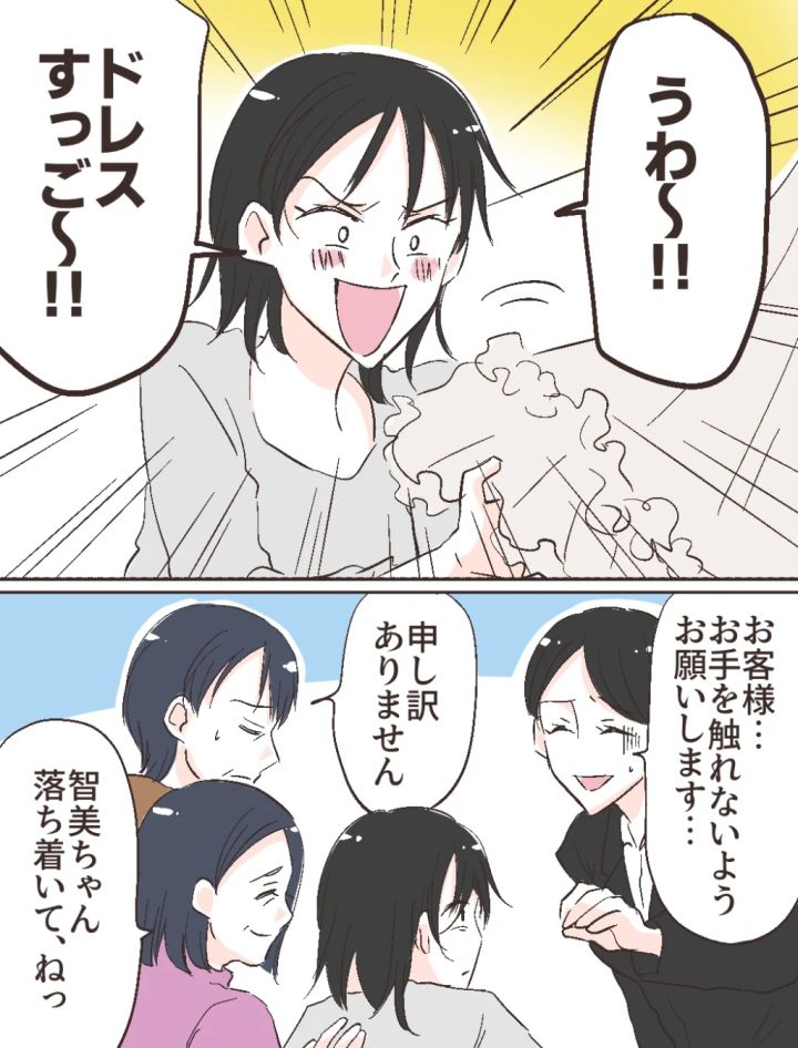 智美さんは試着室に入るなり、「うわ~!ドレスすっご~!」と大興奮。初めて見るウェディングドレスを前に、まるで小さな子どものようにはしゃぎます。それを見たプランナーさんは「お客様、お手を触れないようお願いします・・・」と引き気味。あぁ、身内だと思われるのが恥ずかしい。