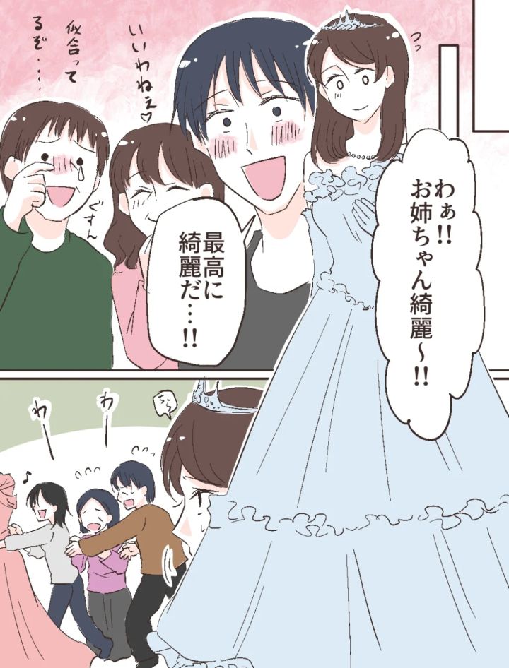 気を取り直して、気になったドレスを試着。修吾や私の家族は、「わぁ!お姉ちゃん綺麗~!」「最高に綺麗だ!」「似合ってるぞ」と思い思いに声をかけてくれます。本来なら楽しいはずのドレス選び。それなのに、視界の端では部屋の奥で騒ぐ智美さんと義両親の姿がちらつき、どうしても気が散ってしまいます。