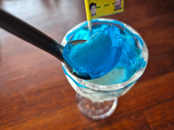 江口浜の青をイメージしたゼリーは、スプーンですくうとシーグラスみたい。ヨーグルトムースは硬めの生クリームのような食感で、甘くコクがありました。