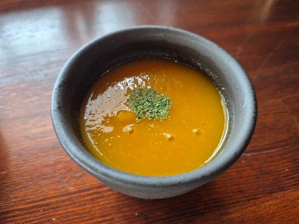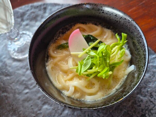 「なんでうどんが!?」と驚きましたが、豆乳スープ仕立てで胡麻のような風味とコクが感じられて、おいしかったです。