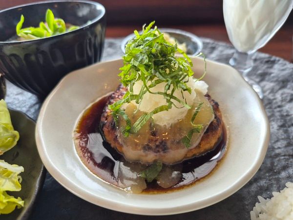 ハンバーグはほどよい柔らかさで、甘辛いソースに大根おろしと大葉がアクセント。さっぱりとした味わいで、チーズやラードのようなコクのあるソースも表面に軽くかかっているので、部分的に濃厚さも感じられました。