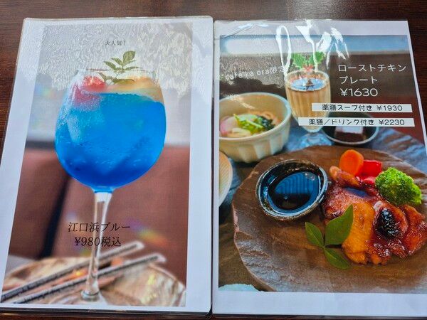 カレーやハンバーガー、平日限定の「ホッとなプレート」も美味しそう。デザートやドリンクも充実しています。